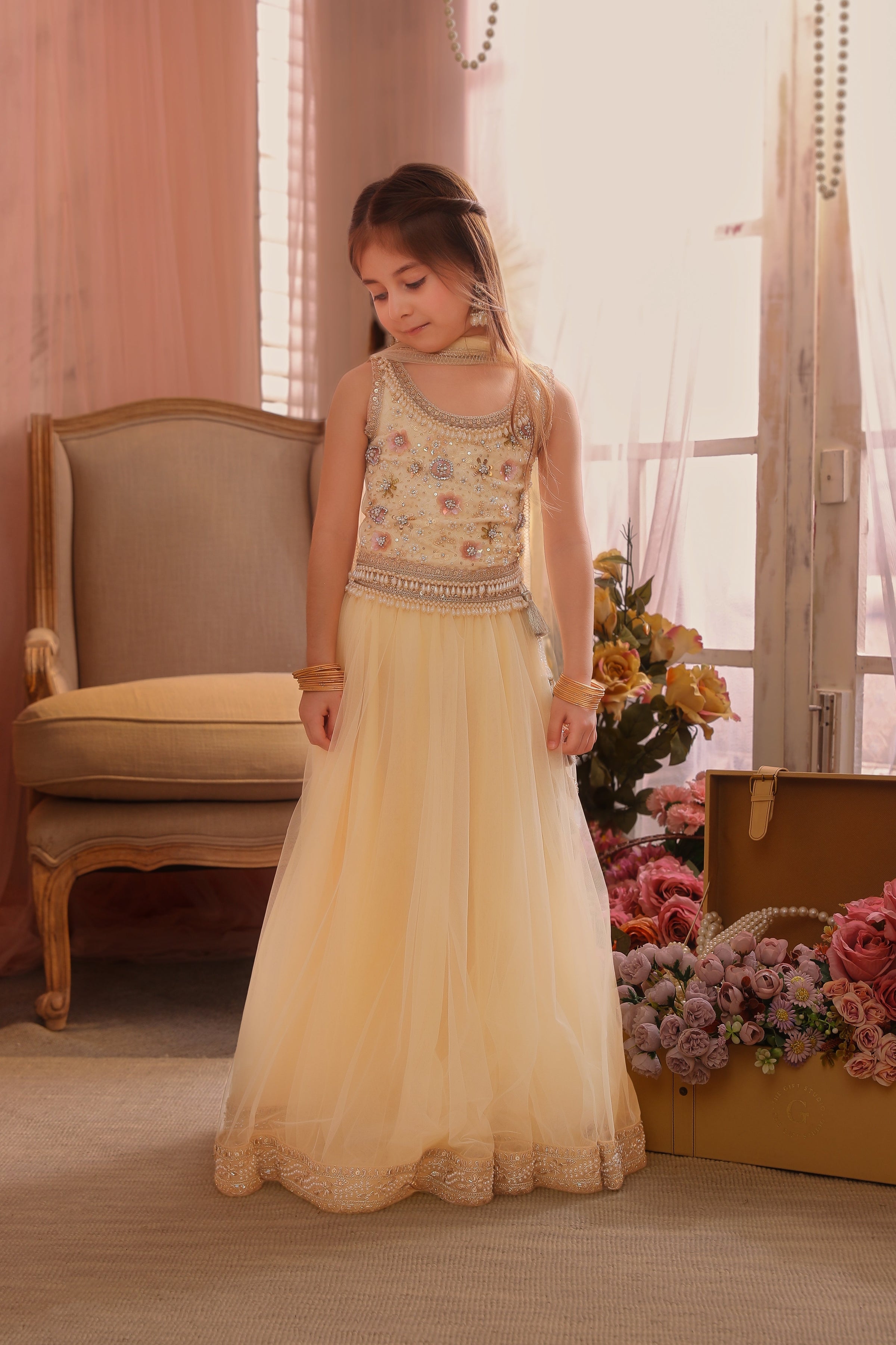 When the lights turn soft and the music swells, she takes the stage in a Aafreen Rules the Hour Lehenga Set that feels like sunshine woven into celebration. Crafted with intricate lace and airy net, its butter yellow tones glow with warmth, joy, and elegance. Flowing layers bring a gentle grace, while the delicate detailing adds the charm of something timeless and heirloom-worthy. Every step becomes a golden twirl — perfect for festive gatherings, Rosée Bagh , or the sparkle of a stage that belongs only to Li'l Divas