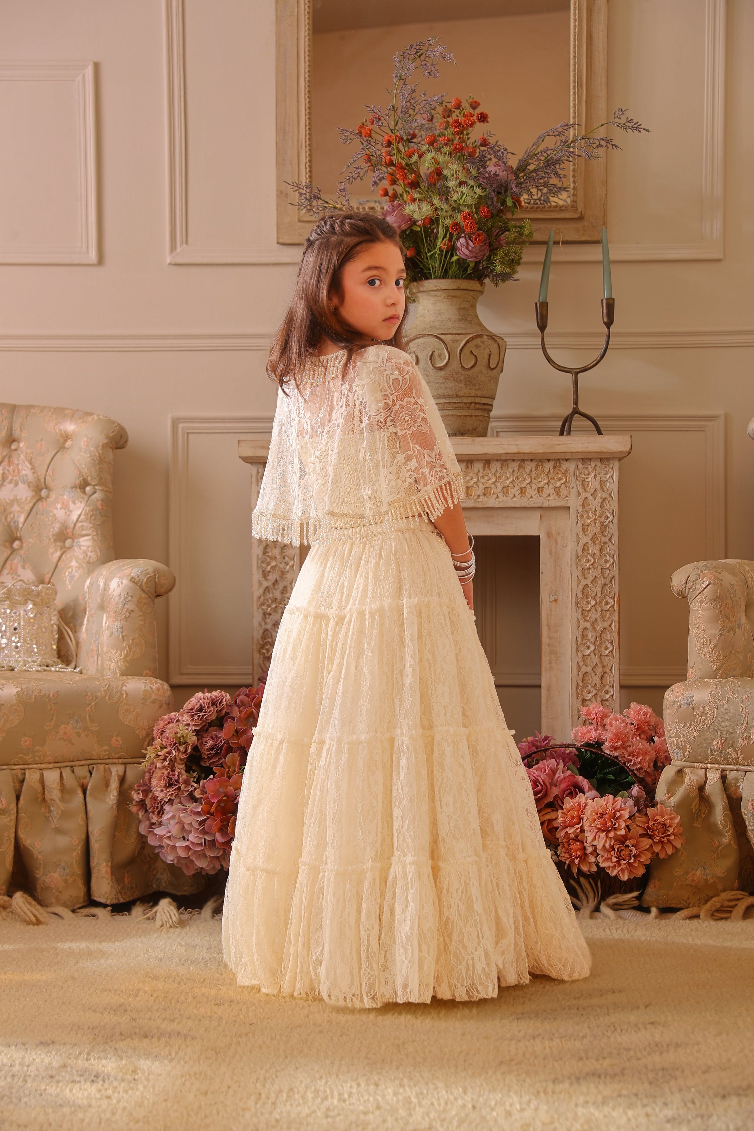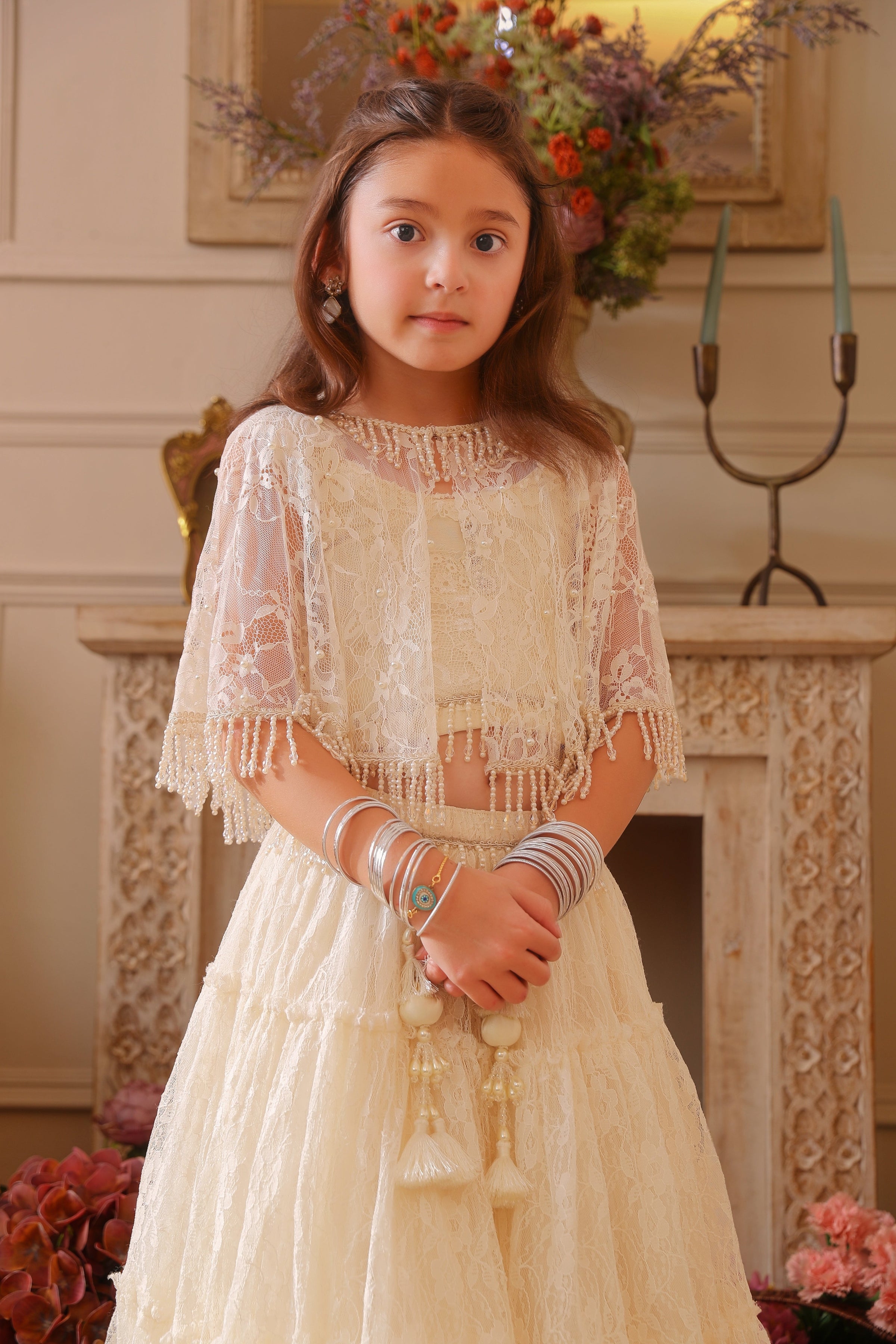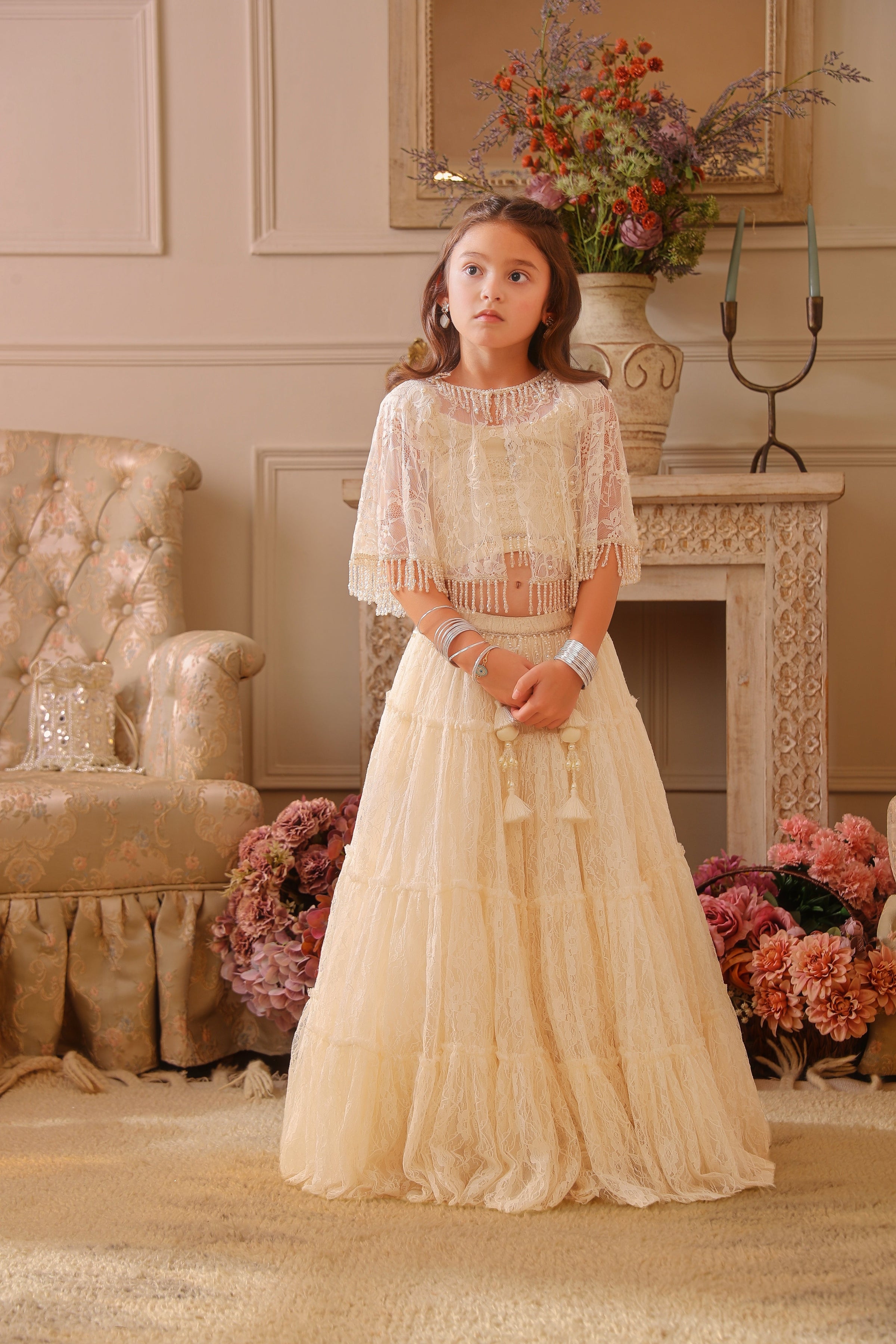 Rosée Bagh collection presents The Stage Falls Silent for Inaya Lehenga Set in Ivory — a design created for little queens. Crafted with delicate lace and soft net, the outfit carries an elegance that feels timeless yet playful. The graceful ivory tones give it a regal charm, while the airy silhouette keeps it light and comfortable for every twirl. Cute, classic, and queen-like this Lehenga Set is perfect for festive & family gatherings, and every moment where our li'l divas deserves to shine with elegance.